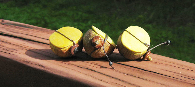I like these little pots the best--they're made from eucalyptus seed pods that I cut not entirely in half--cut the lids from bamboo forks--drilled a few holes for the hemp sting and the closing bead--rubbed them over with sour grass blossoms for the yellow color. These did take awhile to make--the seed pods are tough!