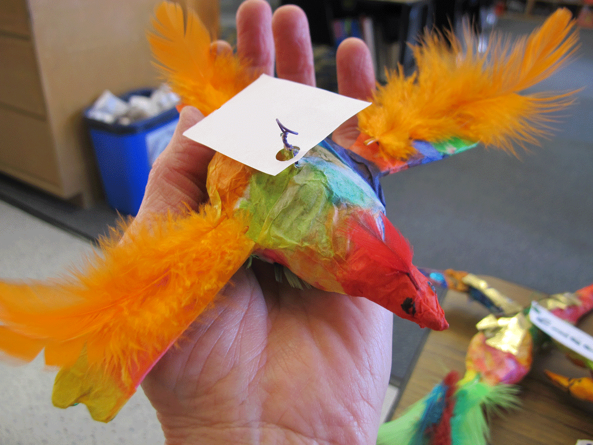 This is my latest art lesson for my granddaughter's 4th grade class. We made tissue mache birds. The body is crumpled newspaper, taped, a wire going down through the center has a loop on top for hanging. Four cut pop sticks are pushed into the body and glued, for the head, tail and two wings. The heads are foil and cut out pieces of cardboard are the wings and tails.